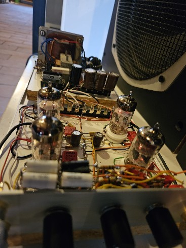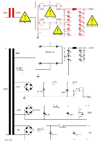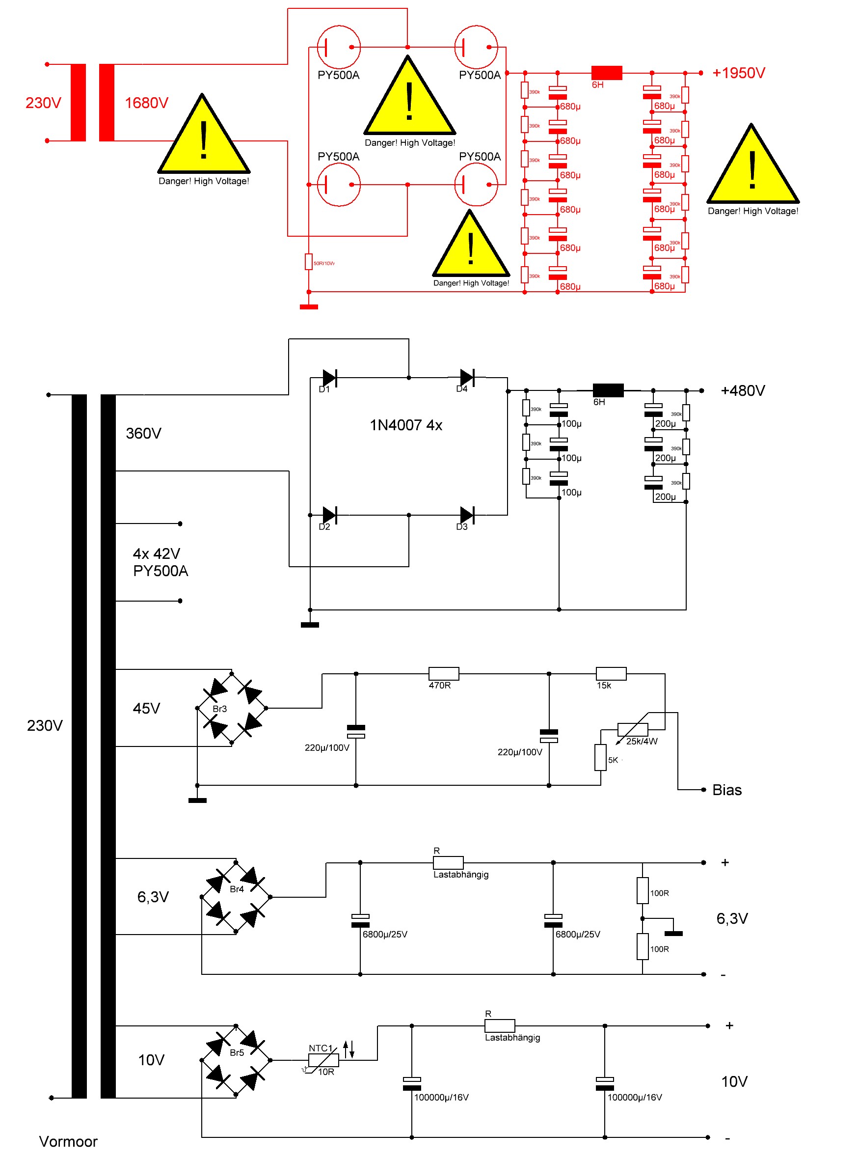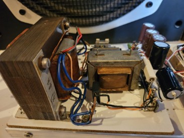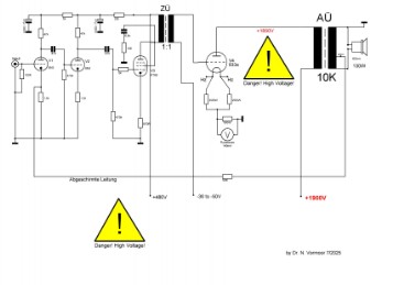 2x 400W Ringkerntrafo Netzteil, 4x PY500A Vollweg-Gleichrichter für die Anodenspannung von 1850V der 833A, 10H HV-Drossel mit Siebkette 12x 680uf/450V; Ruhestrom 140mA pro 833A Endröhre;