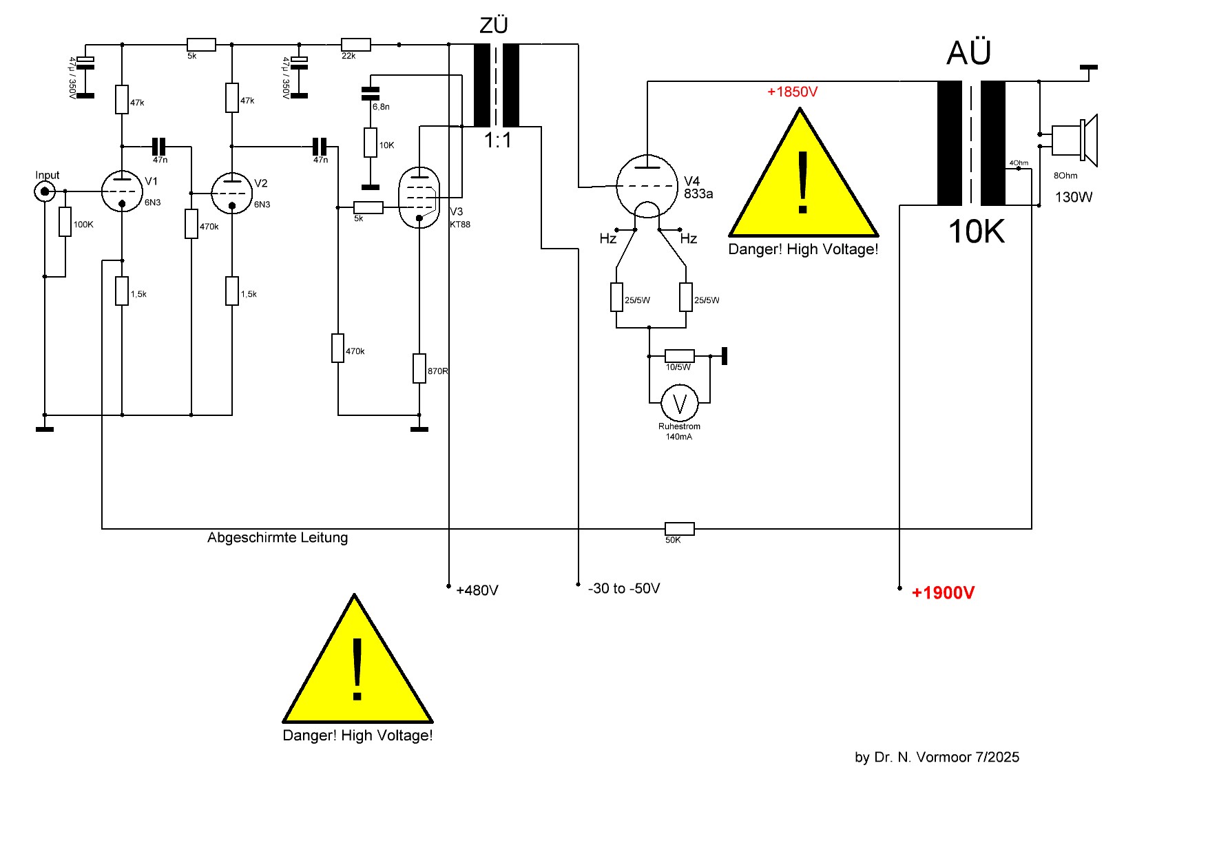 KT88 Treiber Ruhestrom 40mA mit Interstage Schaltung und 450V Anodenspannung;