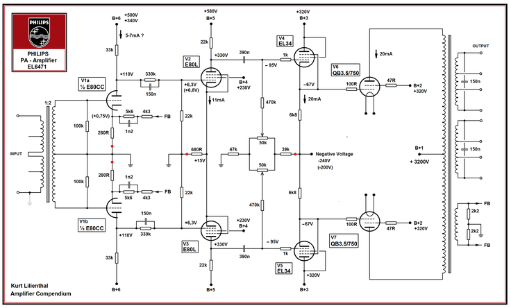 Mit wachsenden Anforderungen in Kinos, Mehrzweckhallen und im Schulfunk folgten Gegentakt Endstufen: zunächst mit EL12, später mit EL34 oder EL503. Philips positionierte diese Geräte in der EL64xx Reihe (z. B. EL6416 ~35 W, EL6426 ~70 W, EL6436 ~140 W). Die Schaltungstechnik verlagerte sich von reinem A Betrieb in Richtung AB und B, um Wirkungsgrad, Aussteuerbarkeit und Kühlung in Einklang zu bringen. Parallel professionalisierte sich die Signal und Netzteiltechnik: symmetrische Eingänge, Treiberreserven und bessere Siebung verringerten Störabstände und Brumm.